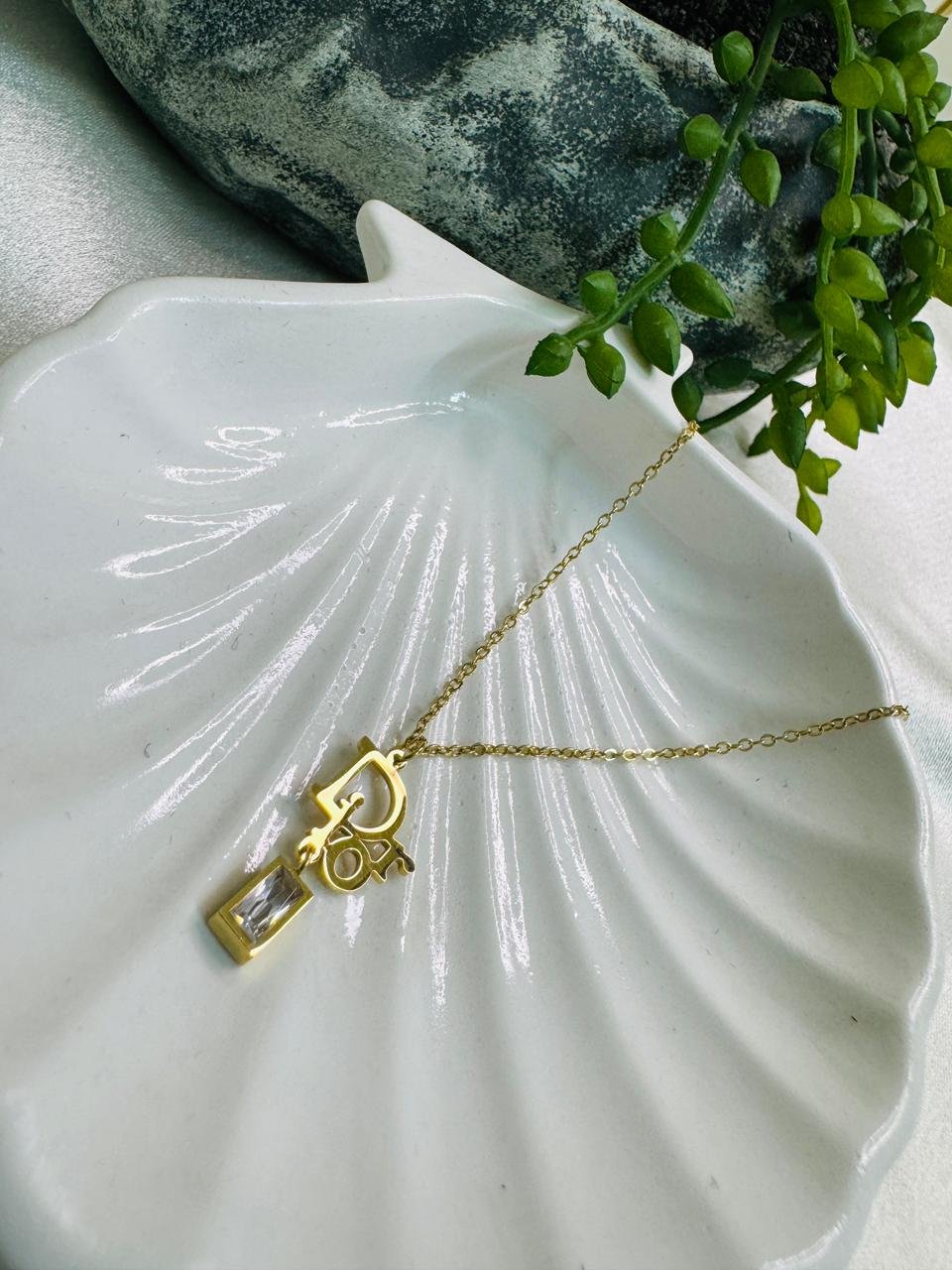 18k gold-plated Christian Dior logo pendant chain with a rectangular crystal charm.