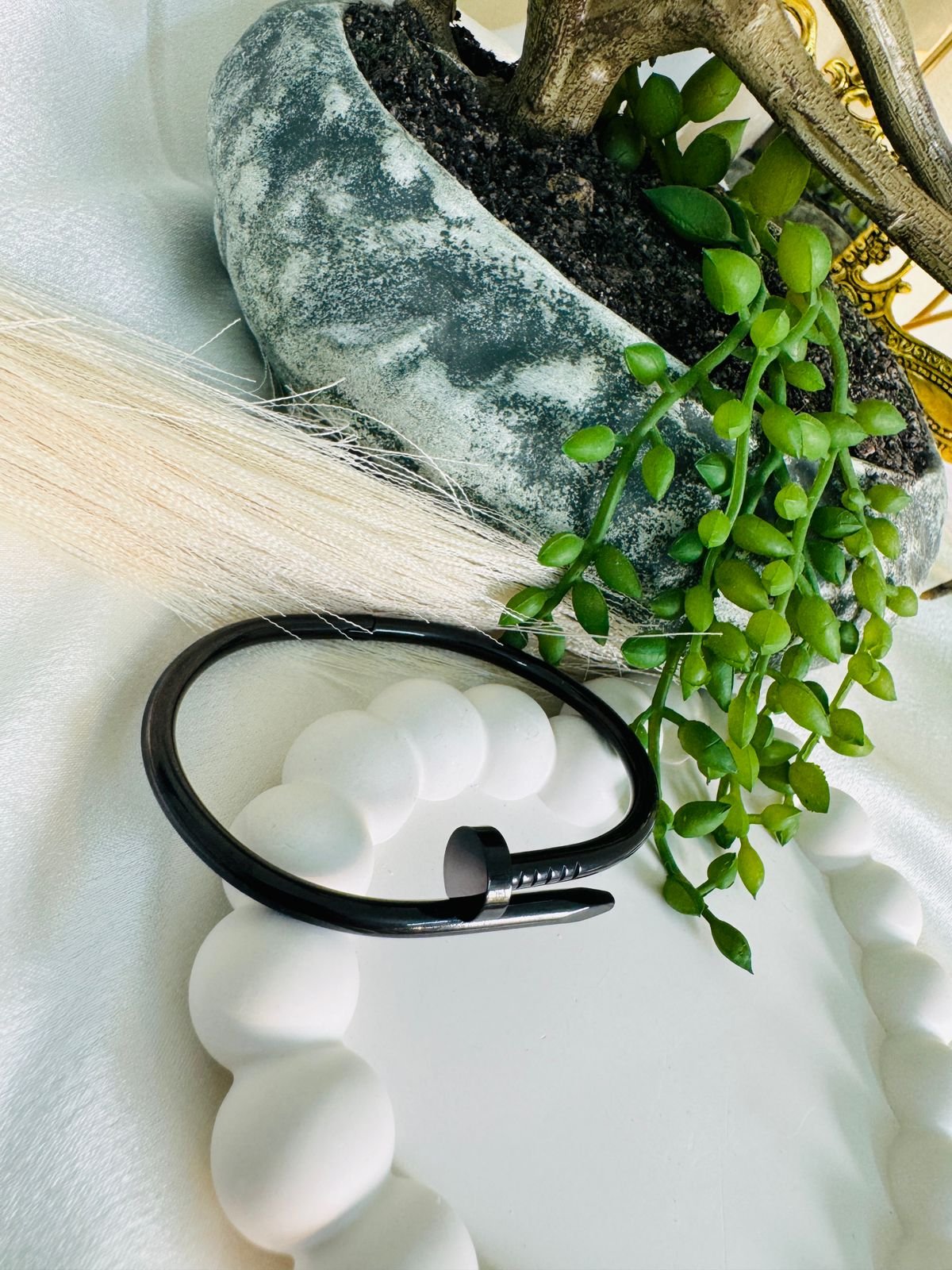 Black nail-style cuff bracelet.