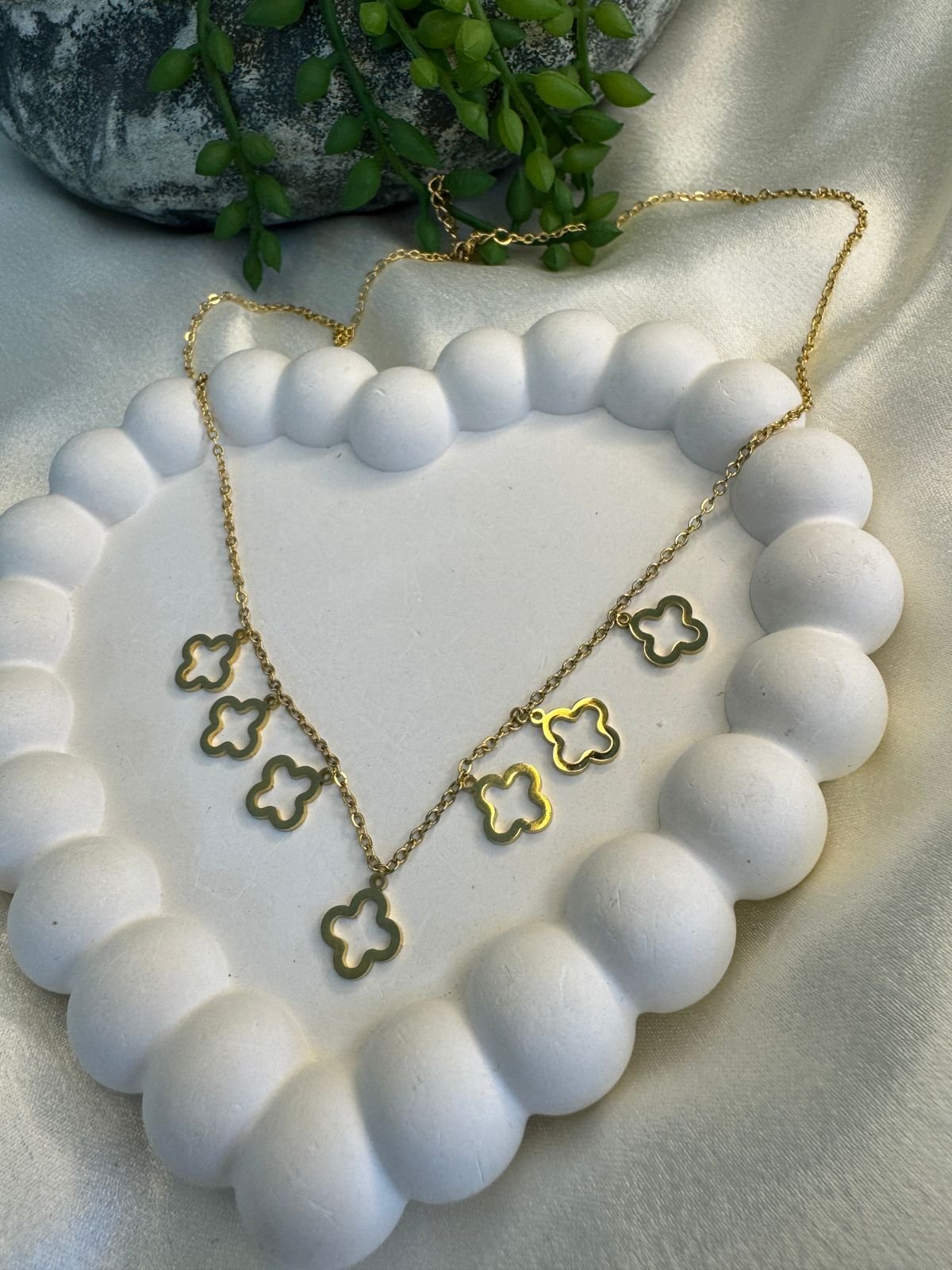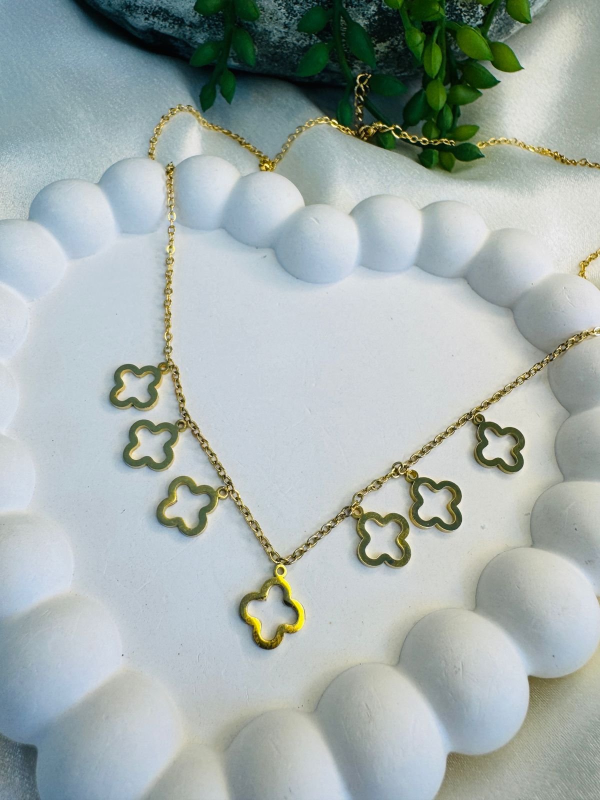 elegant gold-plated stainless steel necklace featuring six delicate clover-shaped motifs.