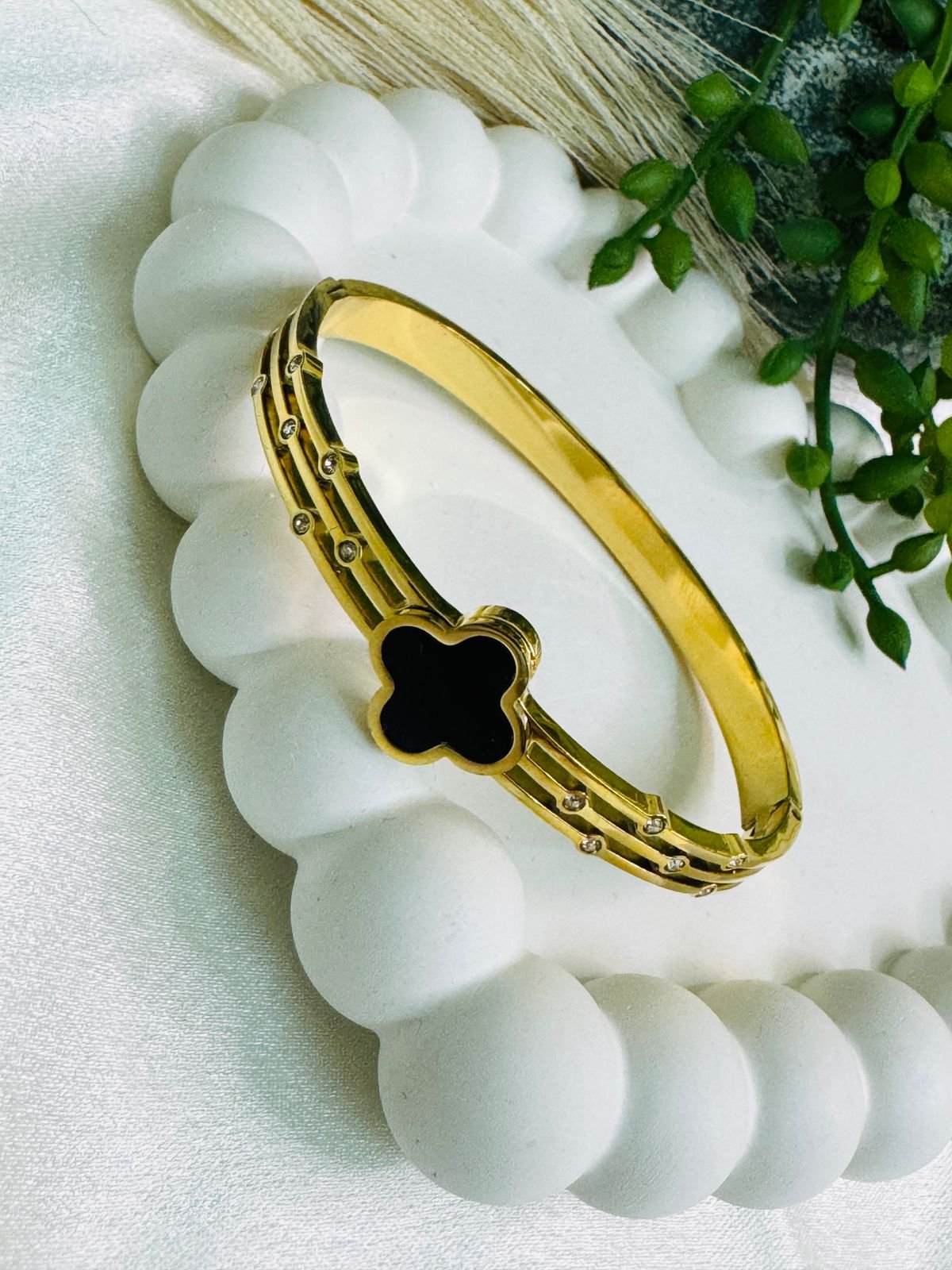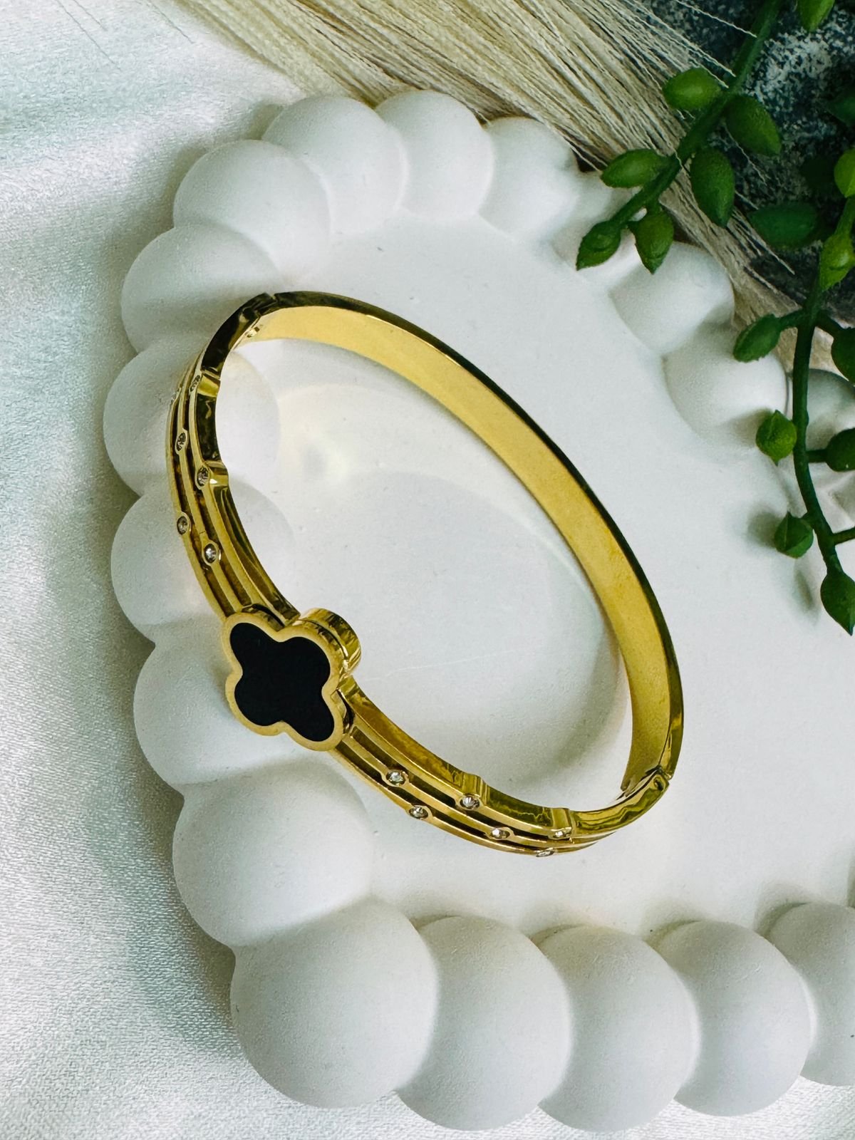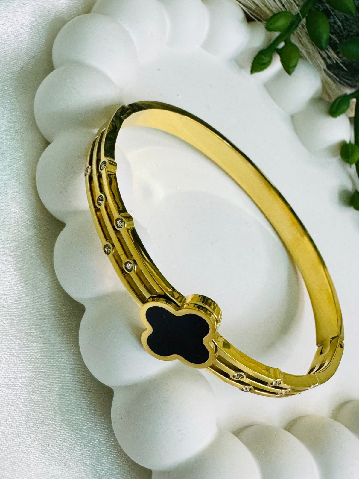 Be the first to review “Gold-plated, anti-tarnish bangle bracelet featuring a black enamel four-leaf clover charm and embedded zircon accents.” Cancel reply