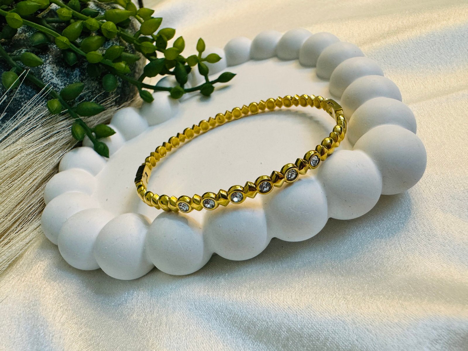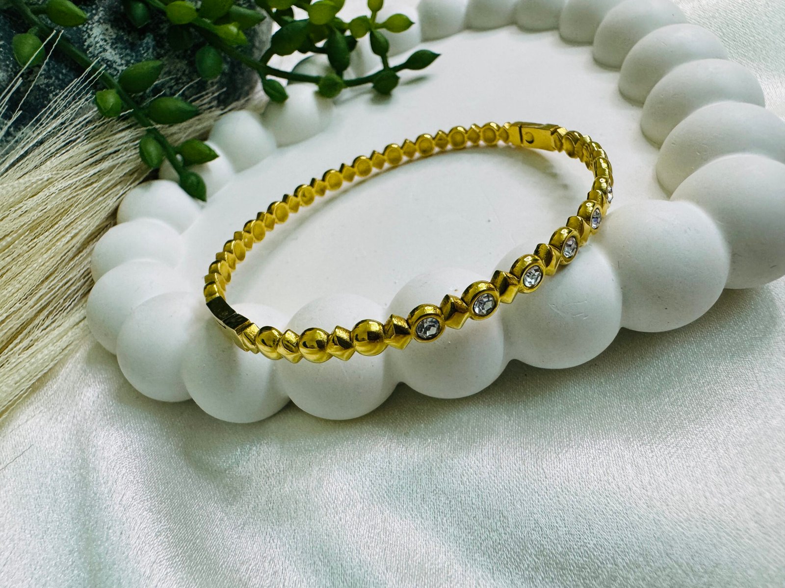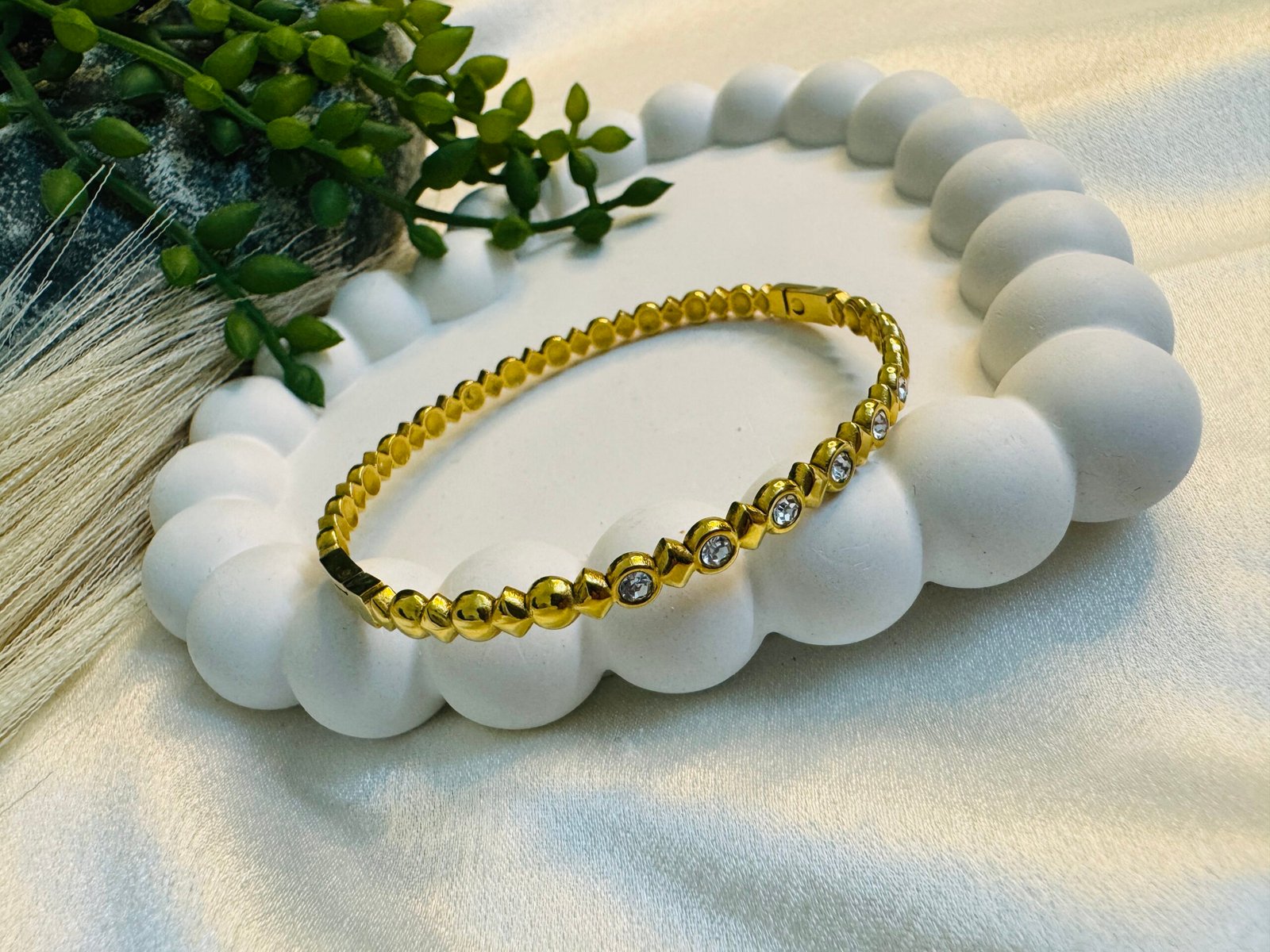 Be the first to review “gold-plated “Bubble Stone Bangle” with a playful bubble pattern and shimmering. Waterproof daily wear.” Cancel reply