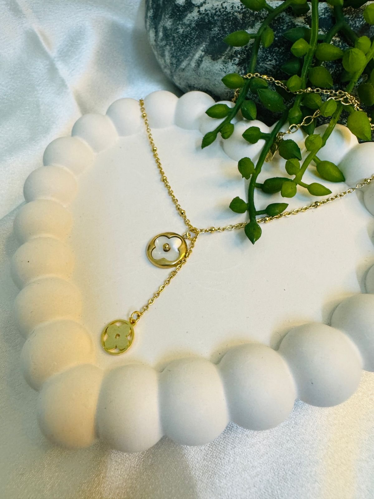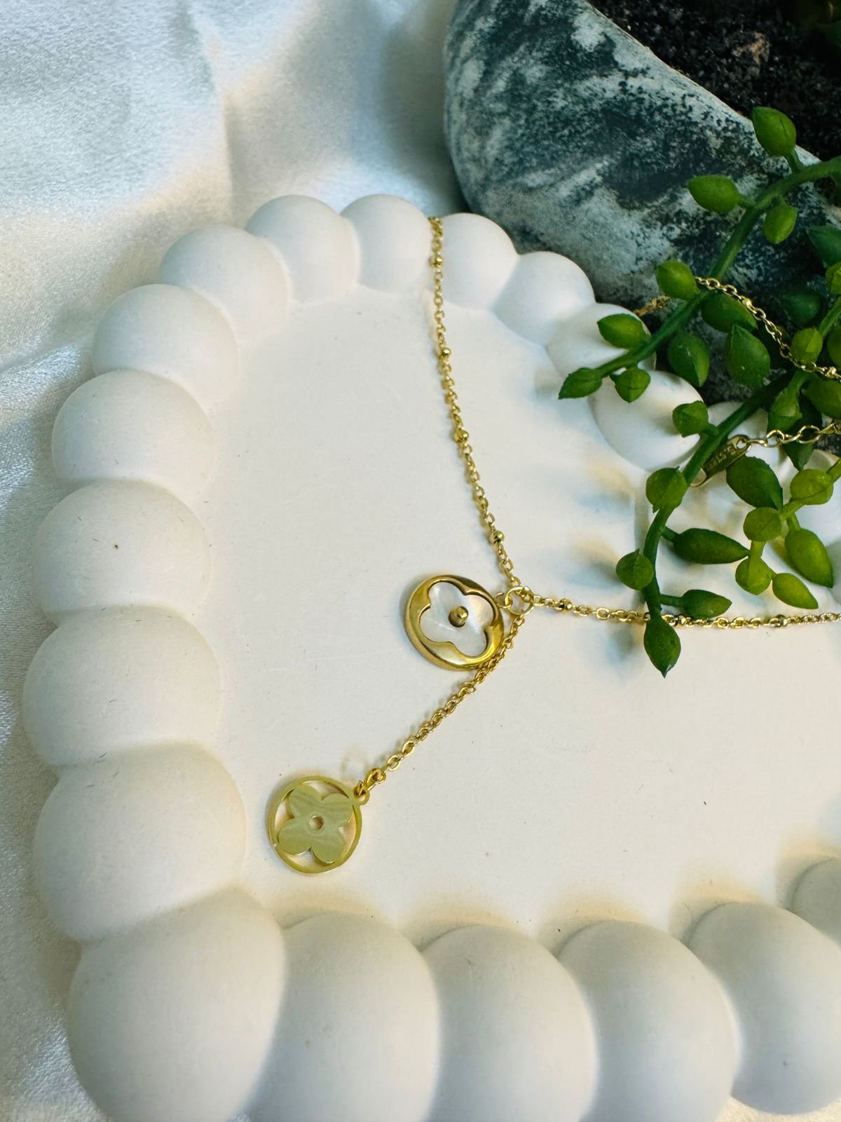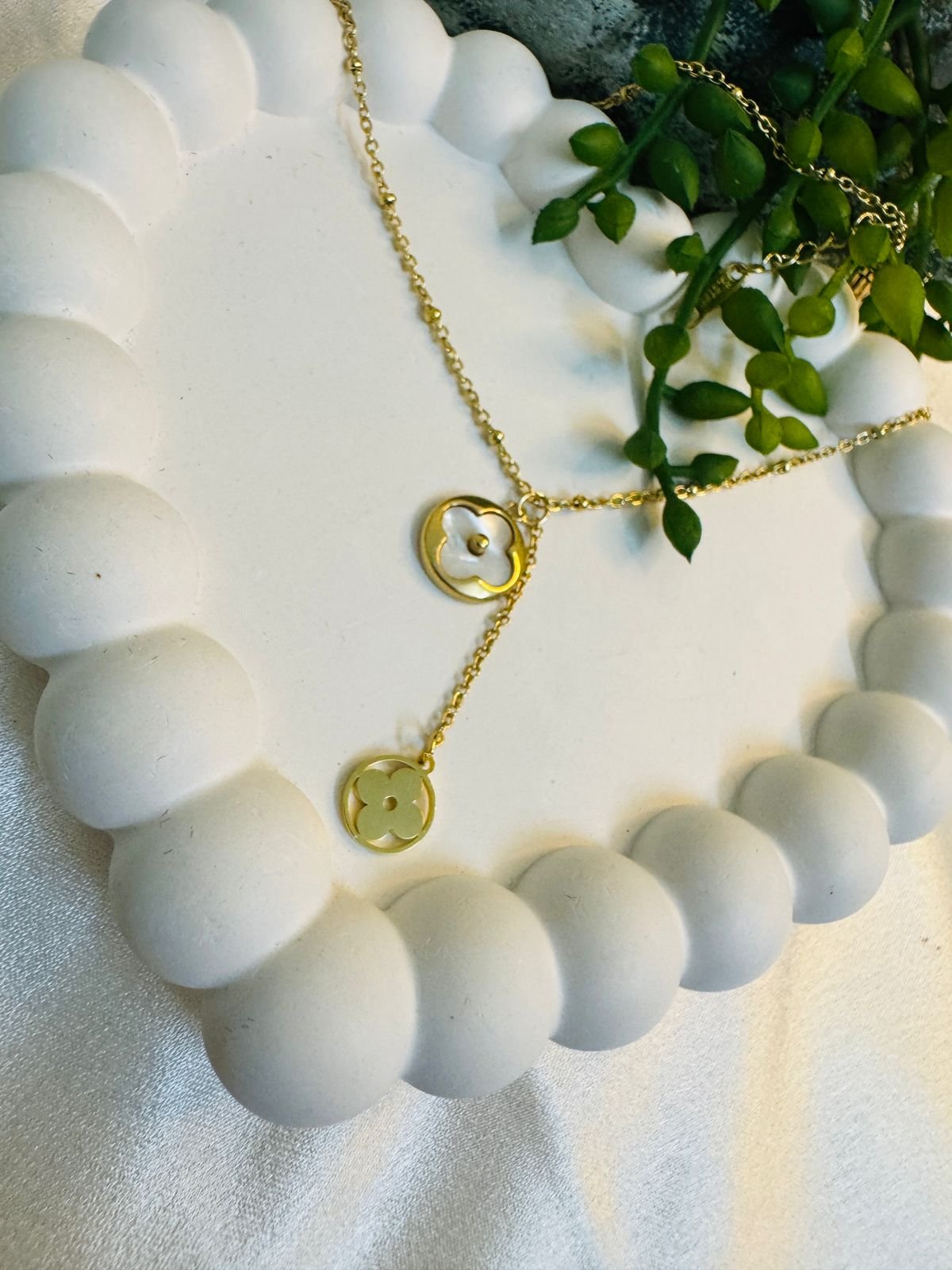 Be the first to review “gold-plated multi-pendant women’s chain featuring clover-shaped charms with a mother-of-pearl or shell inlay.” Cancel reply