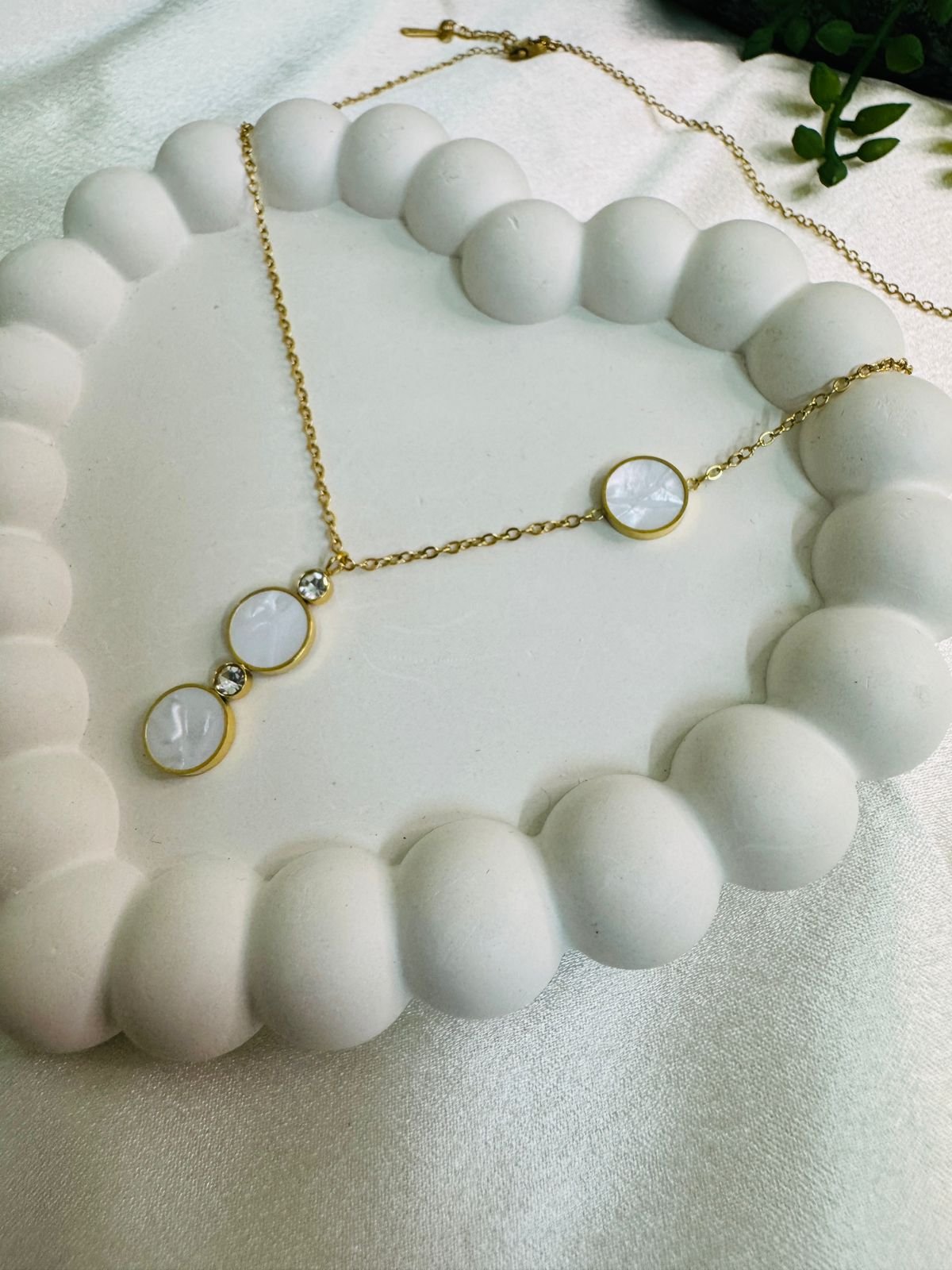gold-plated necklace with circular mother-of-pearl inlays and small clear stones.