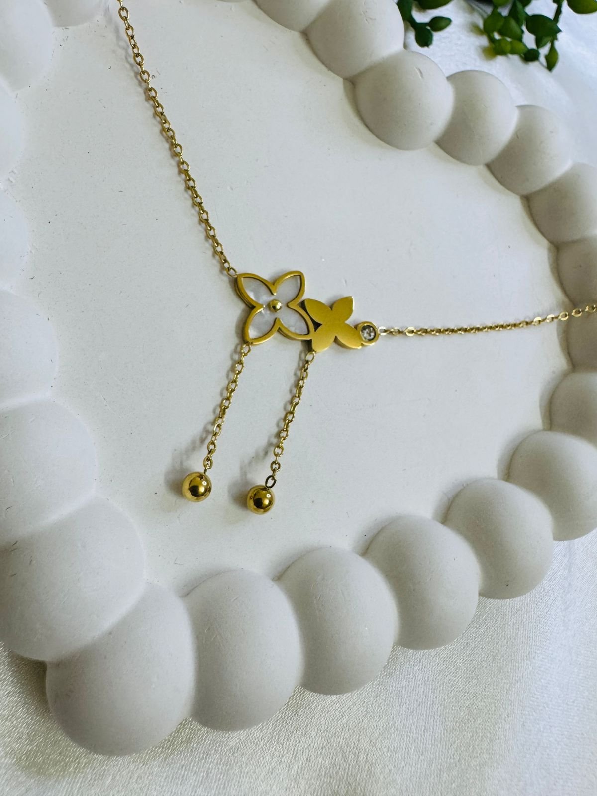 Be the first to review “gold-plated Rommanel chain with a flower and butterfly design featuring a crystal and shell details.” Cancel reply