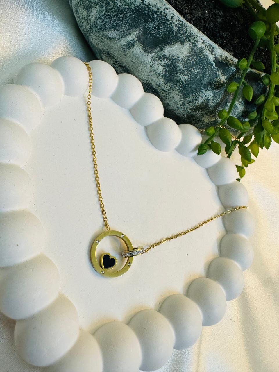 gold-plated stainless steel anti-tarnish circle pendant chain with a black heart charm.