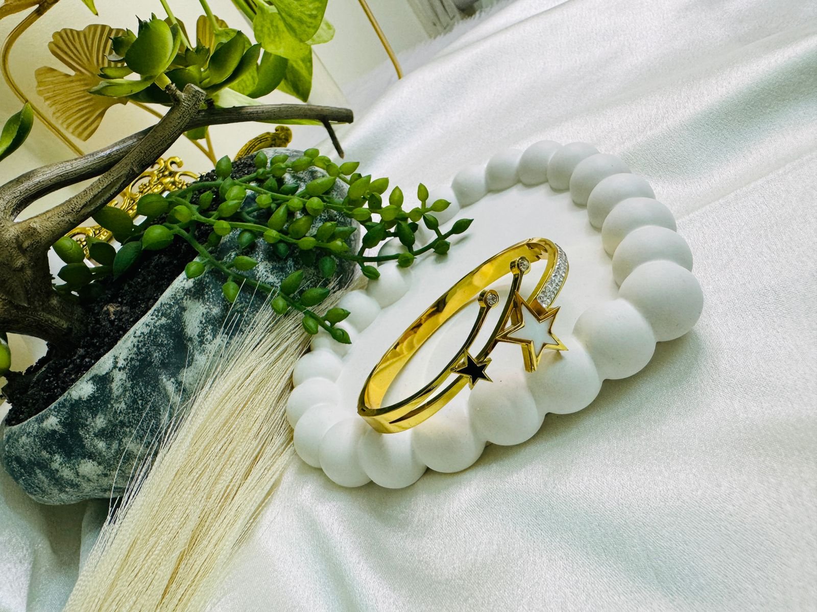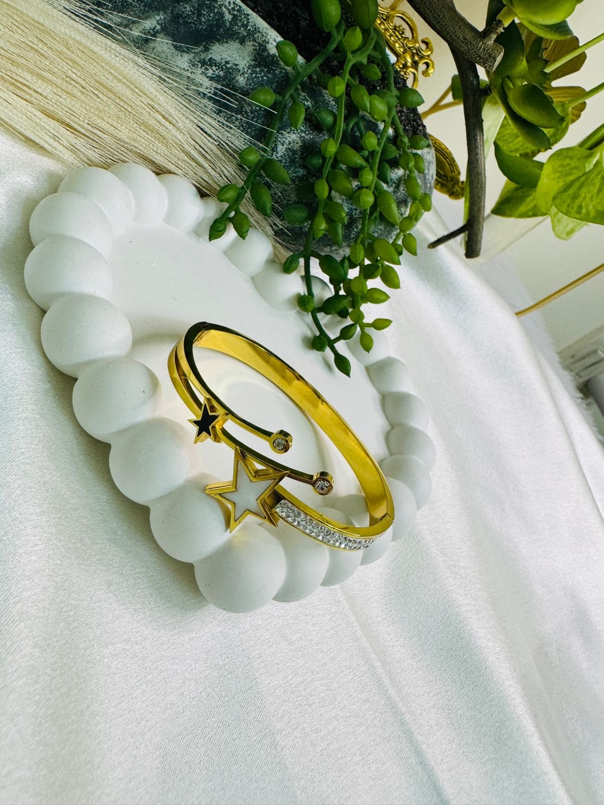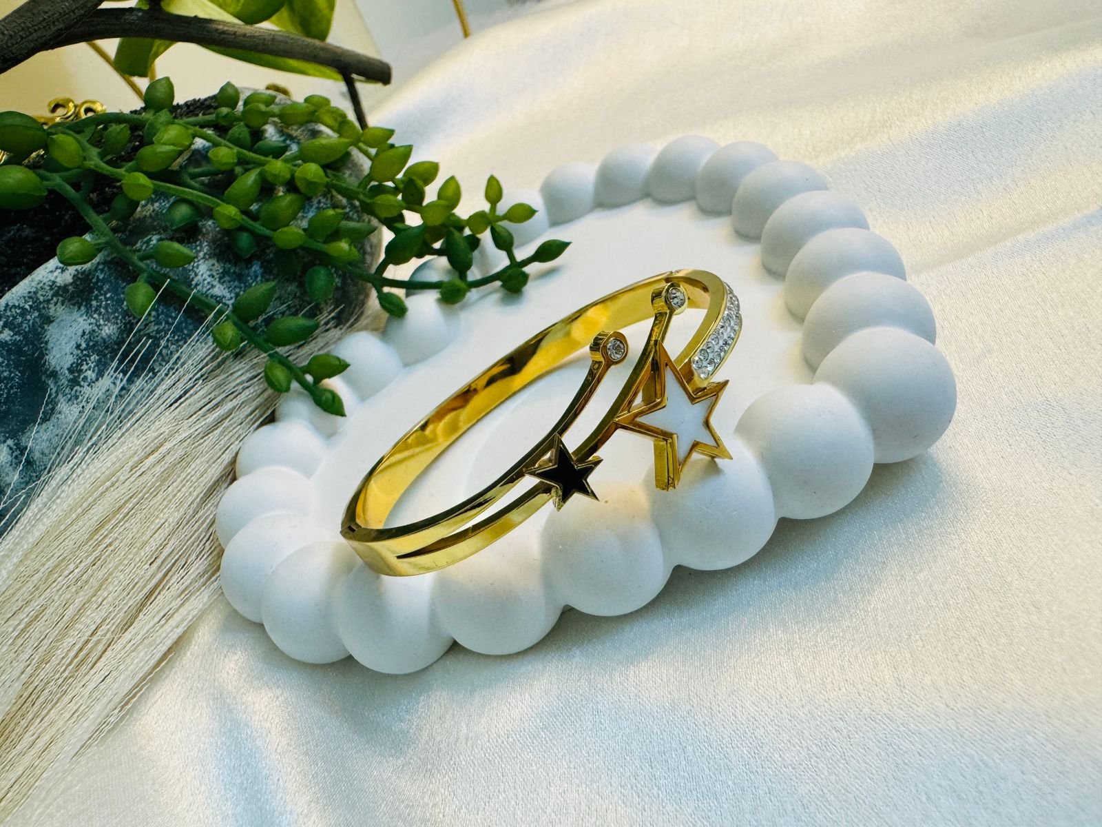 Be the first to review “Gold-tone anti-tarnish bracelet with white and black star embellishments.” Cancel reply