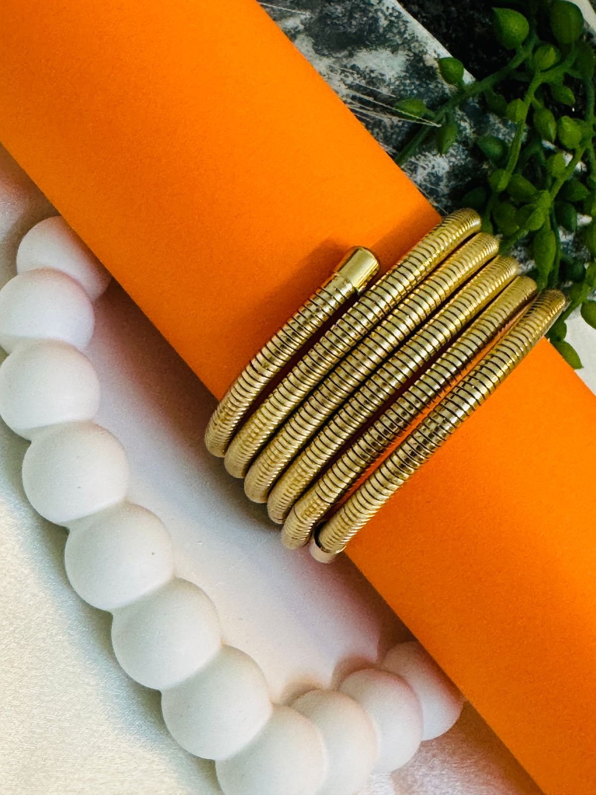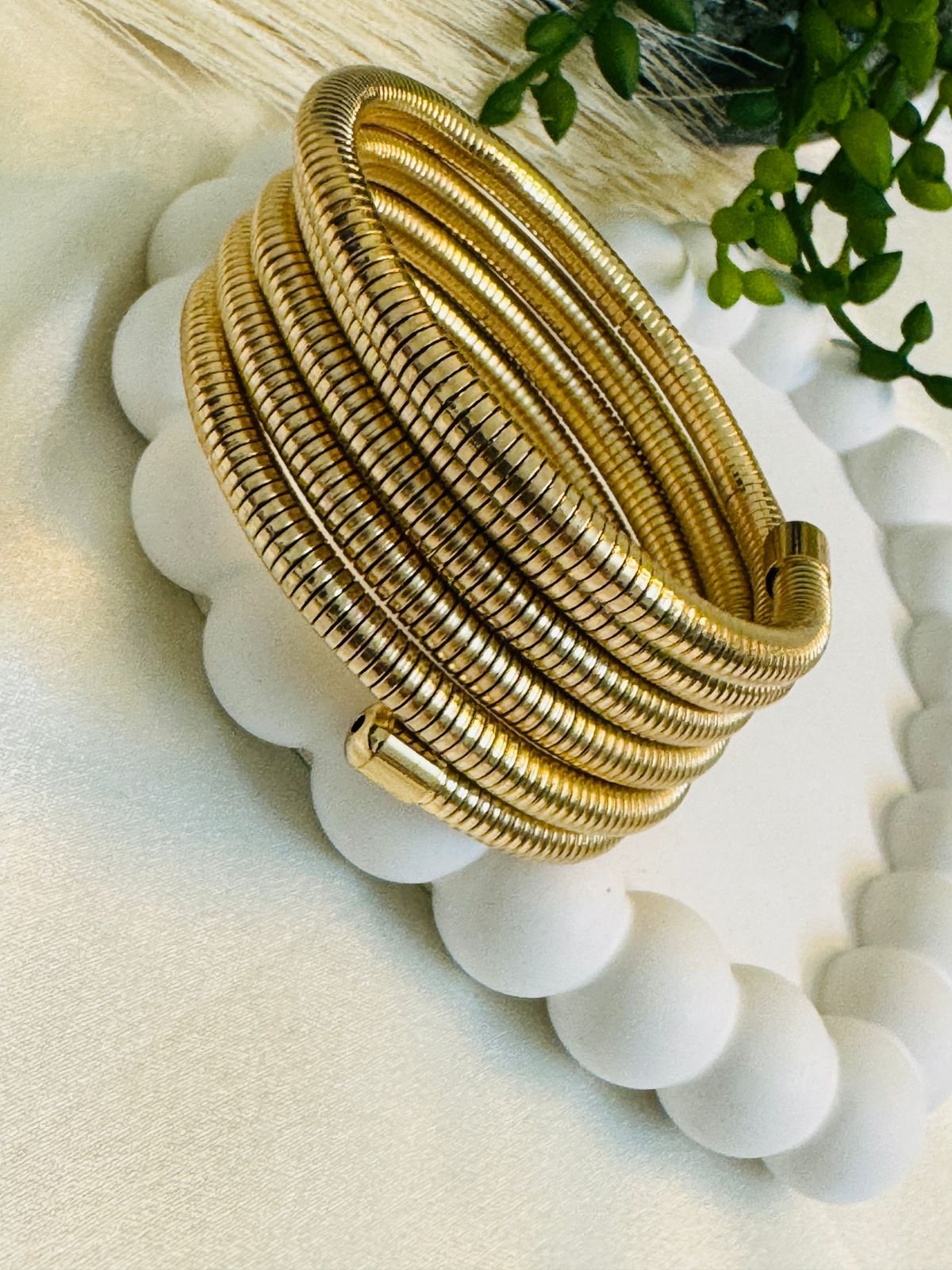 Gold-toned coil bracelet, also commonly known as a multi-layer wrap or spiral bangle.