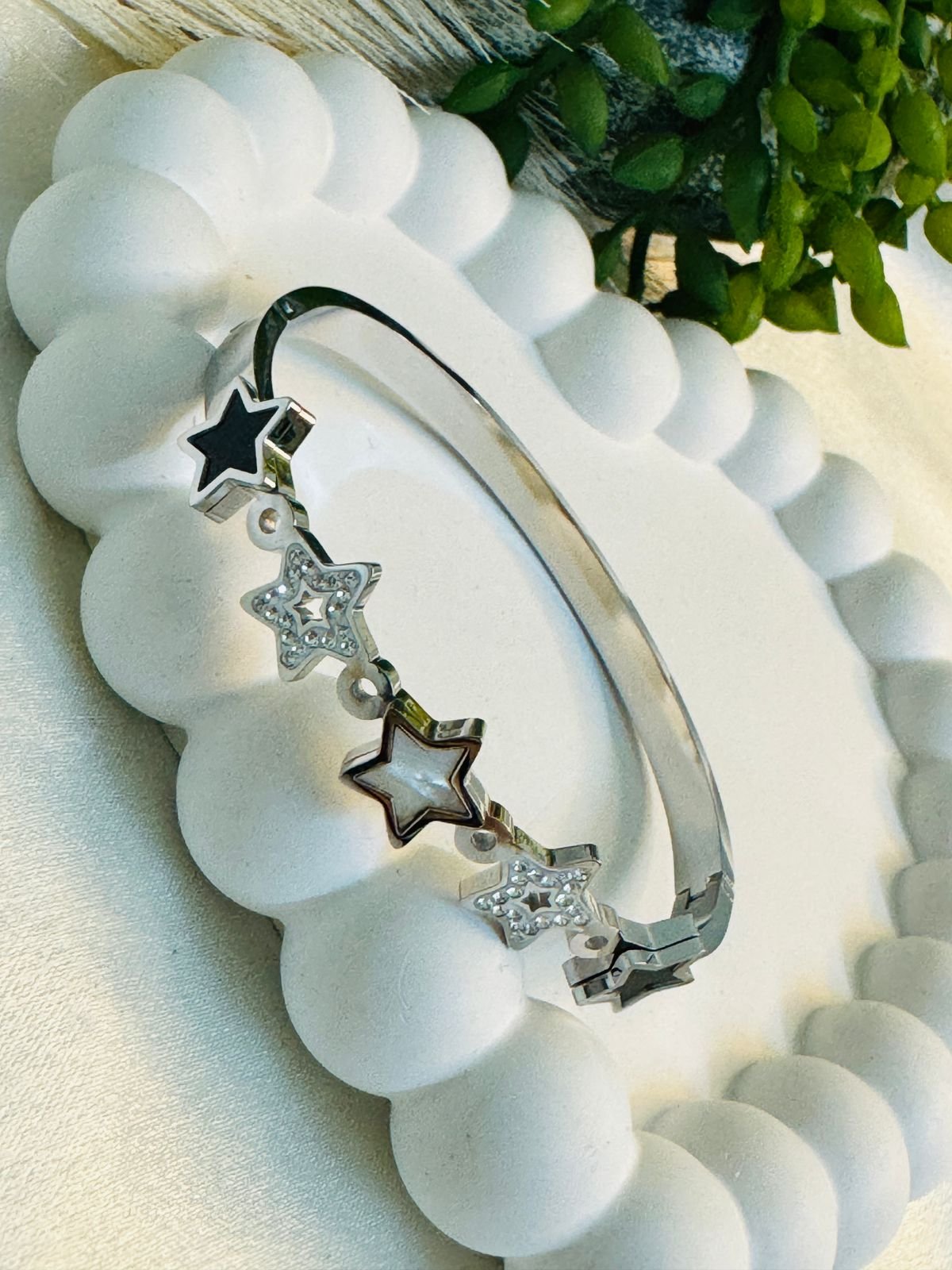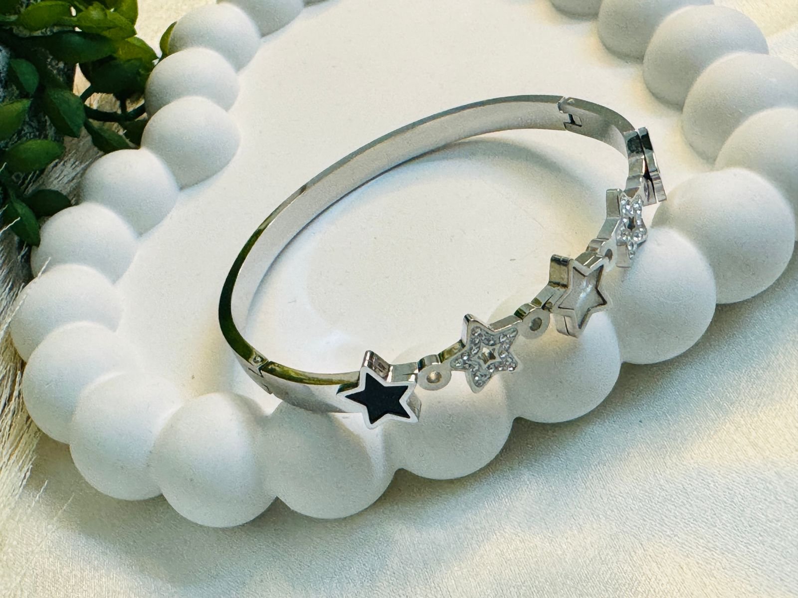 Be the first to review “Stainless steel hinged bangle bracelet with mixed star charms, star-shaped embellishments, some with a black finish, a white mother-of-pearl.” Cancel reply