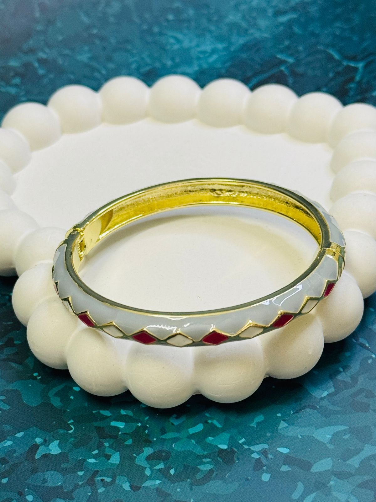 Be the first to review “Turquoise and coral enamel bangle with a geometric pattern.” Cancel reply